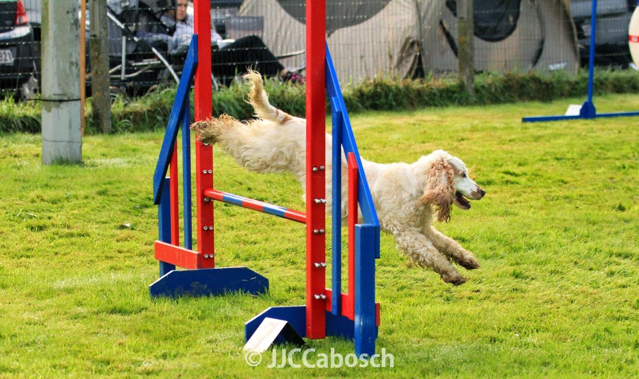 Après un petit plongeon dans la rivière…! 😛 (Je la gardais quand même en laisse car trop de courant et pas envie de plonger pour la récupérer de l’autre côté de la rive qui avait l’air super intéressant!) Le parcours de jumping: plutôt agréable, juste bien se rappeler où aller car on passait plusieurs fois au même endroit! Pour celui-là , c’est moi qui ne suis pas trop dedans, beaucoup d’approximations dans mes placements (j’essayais d’aller le plus vite possible afin d’éviter la drache qui menaçait de tomber!). Nera arrive quand même à me comprendre (merci Nera!) mais fait une barre (ce qui est plutôt rare!). Au final, même avec 4 seconde de dépassement de temps, j’obtiens la seconde place derrière un mini-australien super rapide qui arrive à faire le parcours dans les temps qui, à mon avis, étaient très très courts!!